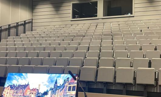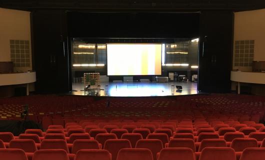 Op deze foto zie je ons grootste projectiescherm (cf. Stagescreen 956 x 560cm) opgebouwd in de prachtige concertzaal (2000 pax) van het Kursaal Oostende. Het scherm is ingehangen met steels, vermoedelijk in een trek. Ook op de foto ka...