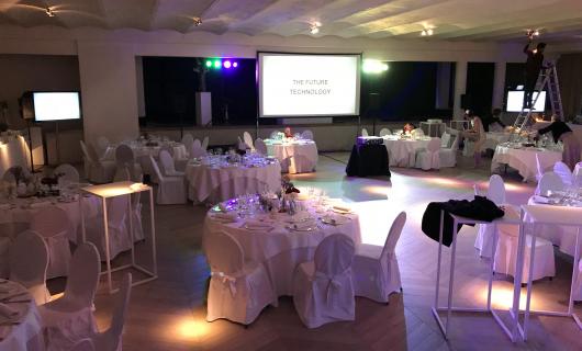 Om in een ruimte van 10x10m iedereen (40 pax) goede zichtbaarheid geven op presentatie werden 2x 70" op voet geïnstalleerd. De 2 schermen werden centraal aangestuurd van uit 1x laptop. Omdat het een licht ruimte betrof, werd er gekoze...