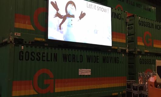 Projectiescherm werd vastgemaakt aan zeecontainer à overkant werd projector geïnstalleerd op gelijkbaardige constructie (cf. 2 zeecontainers op elkaar). Afstand tssn projector en projectiescherm iets meer dan 7m, hierdoor kon er met de...