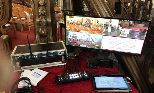 Deze foto's tonen de video-regiedesk van onze huurklant. De huurklant bracht met enkele camera's (waarvan één draadloos) het communie-gebeuren in beeld om direct te vertonen op meerdere schermen die in de zijbeuken van de kerk werden ...