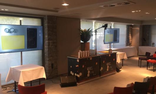 Wij verhuurden enkel 20x 55" schermen voor dit "gecompartimenteerde event". De zaken werden weldoordacht aangepakt en verschillende boxen bleken een nuttige bestaande infrastructuur om effectieve bubbels te creëren voor de genodigden. ...