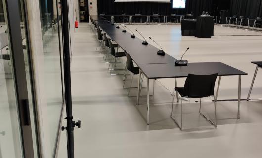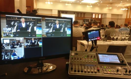Deze huurder is erin geslaagd. In elke zaal kwam een UN70 PTZ camera op statief te staan, alsook 2 draadloze hoofdmicro's en een audiomixer. De audiomixer gaf een Mini Jack geeft naar de UN70 die deze kan embedden op haar SDI output...