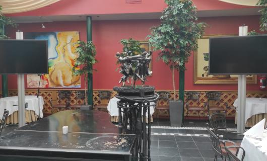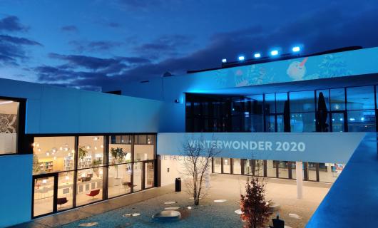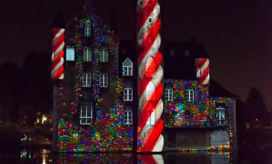 Met beperkte materiaallijsten kunnen zeer sfeervolle zaken gerealiseerd worden. De lichtbron voor deze kunstzinnige intallatie betrof 2 Nec Short throw projectoren.