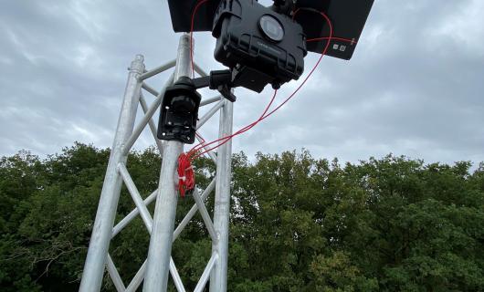Deze foto kregen we net binnen van een Nederlandse huurder. Uit de foto kunnen ook wij (als verhuurder) veel leren. Om de Camdo-housing te monteren wordt er gewerkt met vierkantige truss (vermoedelijk opgesteld op base plate) en de hous...