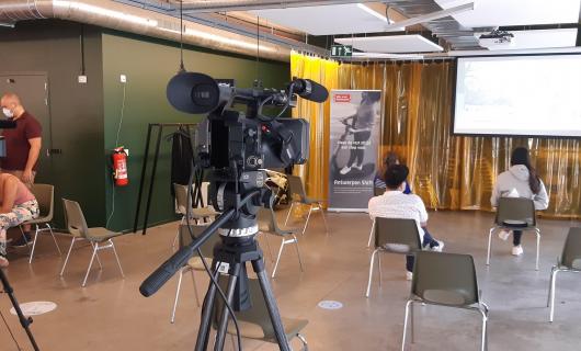 Ook deze foto (van STAKE5.be videomateriaal actief in het veld) kregen we toegestuurd van een Franstalige huurklant. Deze huurklant gebruikte ons materiaal om een panelgesprek in beeld te brengen en te livestreamen. Bij het "retourges...