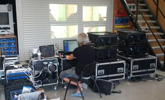 In samenspraak met de huurklant kwamen we overeen dat deze bij ons een aantal test kon uitvoeren. Op de foto kan je onze pt dz13k's (uitgerust met rental frame) in werking zien. Deze werden aangestuurd via 4x HDMI die uit de Datapath...