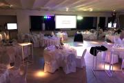 De projectiesetup werd centraal in het midden geplaatst met aan weerszijden 2x 65" flatscreen op inox voet.