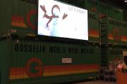 Projectiescherm werd vastgemaakt aan zeecontainer à overkant werd projector geïnstalleerd op gelijkbaardige constructie (cf. 2 zeecontainers op elkaar).