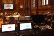De foto geeft in één oogopslag een blik op de regiedesk alsook de qsc K10 speakers op elegante "K&M space saving stands". Het projectiemateriaal was reeds aanwezig en werd mee opgenomen in de AV-setup.
