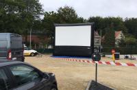 Dit projectiescherm bestaat uit een luchtframe (vergelijkbaar als bij een luchtkasteel) waarin een projectiedoek van 610 × 343 cm wordt gespannen (standaard leveren wij een FRONT-doek mee, maar op aanvraag kunnen wij ook een RETRO-doek voorzien).